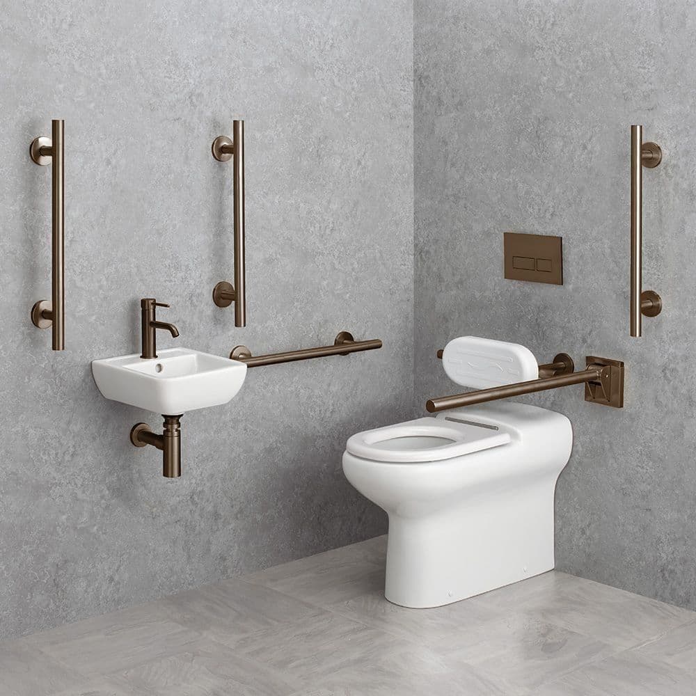The Healey & Lord Urban Disabled Close Coupled Toilet Pack in Brushed Bronze is a complete Doc M compliant washroom solution, including raised height close coupled toilet, wash basin and tap, 5x 620mm grab rails and an 800mm drop-down support arm.