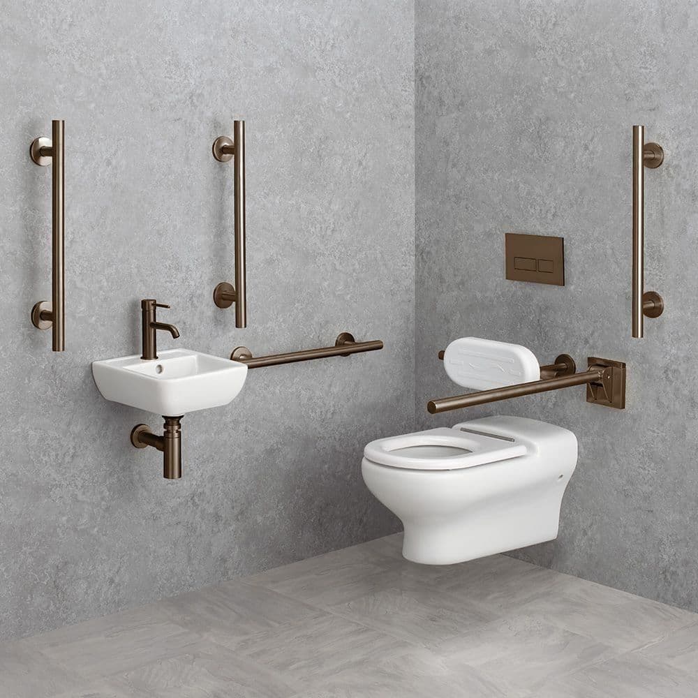 The Healey & Lord Urban Disabled Close Coupled Toilet Pack in Brushed Bronze is a complete Doc M compliant washroom solution, including raised height close coupled toilet, wash basin and tap, 5x 620mm grab rails and an 800mm drop-down support arm.